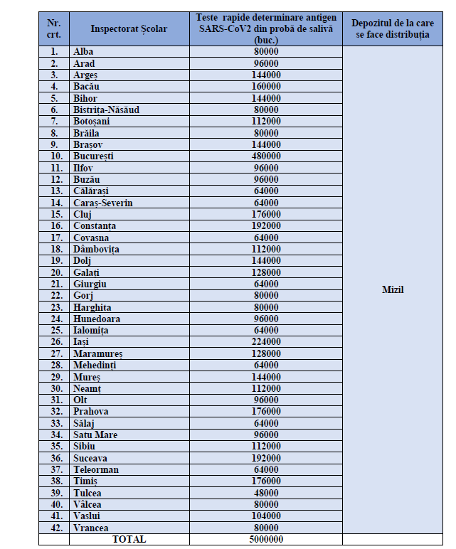 “Conform informărilor primite din partea IGSU și ISJ/ISMB, primele teste de salivă din lotul de 6,5 milioane au ajuns încă de ieri în teritoriu, distribuția urmând a se finaliza în cursul zilei de astăzi. Inspectoratele școlare județene vor asigura distribuția acestor teste către fiecare unitate de învățământ, pentru testarea tuturor preșcolarilor, elevilor și personalului din școli sau grădinițe”, a declarat ministrul Educației.
