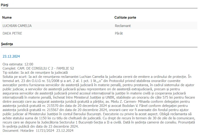 „Soluția pe scurt: Ia act de renunţarea reclamantei Luchian Camelia la judecata cererii de emitere a ordinului de protecţie. (…)