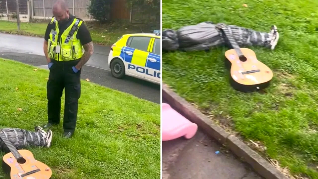 Imaginile arată un ofițer de poliție apropiindu-se de ceea ce pare a fi un cadavru înfășurat în saci de gunoi cu adidași în picioare și o chitară lângă el, moment care părea un fragment dintr-un documentar despre crime adevărate, scrie nypost.com.