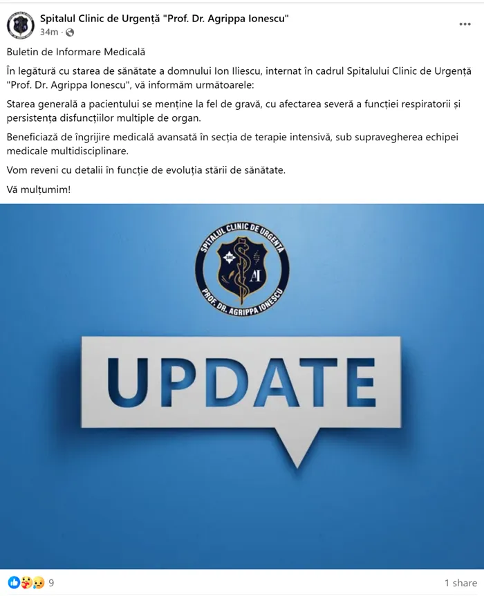 Potrivit noului buletin de informare medicală, starea de sănătate a fostului președinte Ion Iliescu se menține „la fel de gravă”. Medicii transmit că președintele suferă de „o afectare severă a funcției respiratorii” și de „persistența disfuncțiilor multiple de organ”.