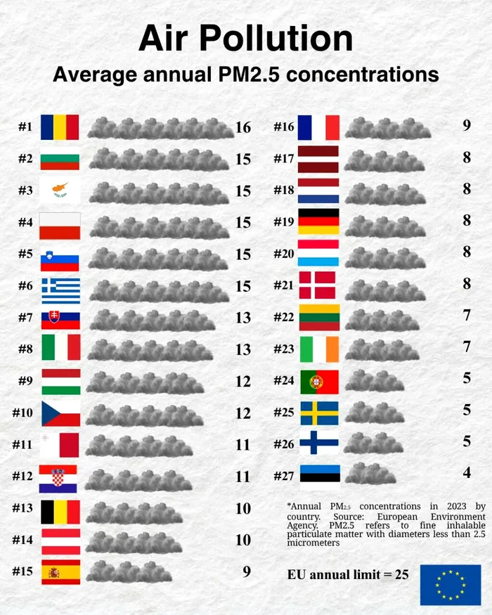 Ţara noastră are o concentraţie medie de particule în suspensie de 16, în timp ce ale altor ţări precum Bulgaria, Cipru şi Polonia se află la 15. Cel mai mic grad de poluare este în Estonia, unde PM 2,5(particule în suspensie) atinge nivelul 4.