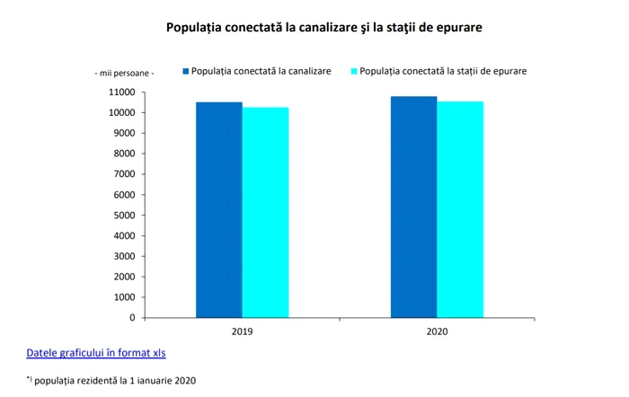 În ceea ce priveşte epurarea apelor uzate, populaţia conectată la sistemele de canalizare prevăzute cu staţii de epurare a fost de 10.540.388 persoane, reprezentând 54,5% din populaţia rezidentă a ţării, cu 276.086 persoane mai mult decât în anul 2019.