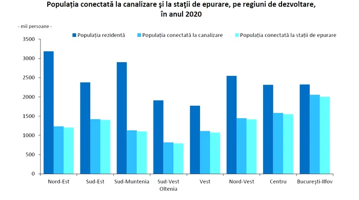 La nivelul regiunilor de dezvoltare, ponderea cea mai mare a populației conectată la sistemele de canalizare, în total populație rezidentă, s-a înregistrat în regiunea București-Ilfov (88,5%), urmată de regiunea Centru (68,3%) și Vest (62,8%). – raport INS.