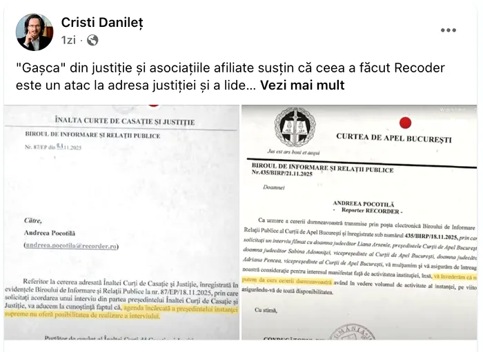 O serie de documente publicate pe Facebook de fostul judecător, Cristian Danileț, un susținător al taberei USR/ Rezist din Justiție și luate din documentarul Recorder, indică faptul că jurnaliștii au solicitat punct de vedere de la ÎCCJ și de Curtea de Apel înainte de publicarea filmului controversat „Justiție capturată”, dar judecătorul nu menționează și modul cum a fost cerut punctul de vedere șefilor de instituții.