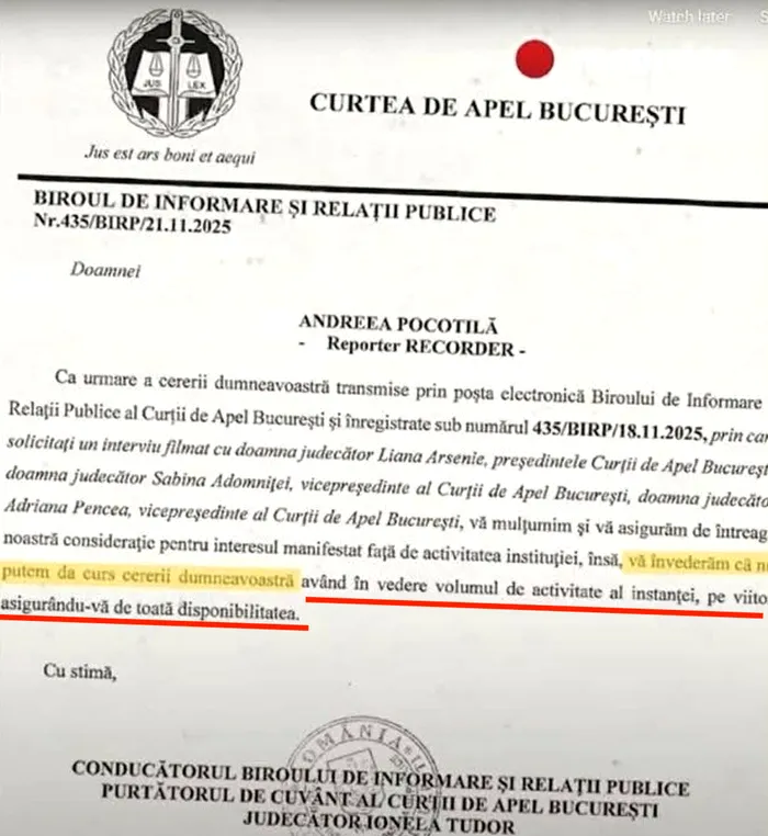 Așa cum arată și fostul judecător Cristian Danileț, judecătoarele Liana Arsenie, Sabina Adominței și Adriana Pencea de la Curtea de Apel București – mulțumesc și asigură Recorder „de întreaga considerație pentru interesul manifestat față de activitatea instituției”, dar le transmit jurnaliștilor că nu pot da curs cererii având în vedere volumul de activitate al instanței, „pe viitor asigurându-vă” de toată disponibilitatea”.