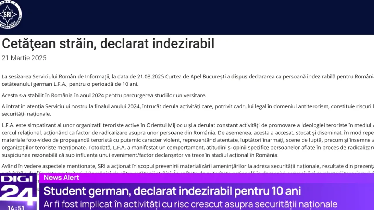 La sesizarea Serviciului de Informații, Curtea de Apel din București a hotărât ca cetățeanul german să fie declarat ca persoană indezirabilă în România pentru o perioadă de 10 ani. Acesta venise la studii încă din anul 2024, a intrat în atenția SRI încă de anul trecut, după ce s-a descoperit că avea activități care, potrivit legilor antiterorism, prezintă riscuri la adresa securității naționale.