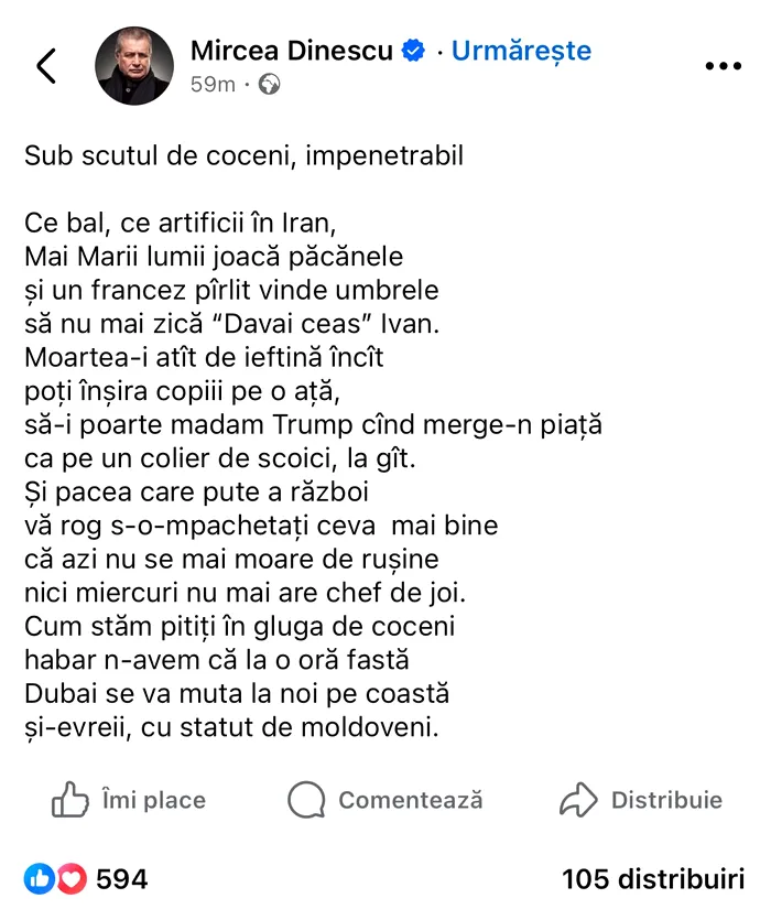 Mircea Dinescu a publicat pe Facebook o poezie plină de ironie socială și politică, în care comentează criza din Orientul Mijlociu, îngrijorările privind securitatea europeană și umbrela nucleară, despre care s-a tot discutat în ultimele zile.