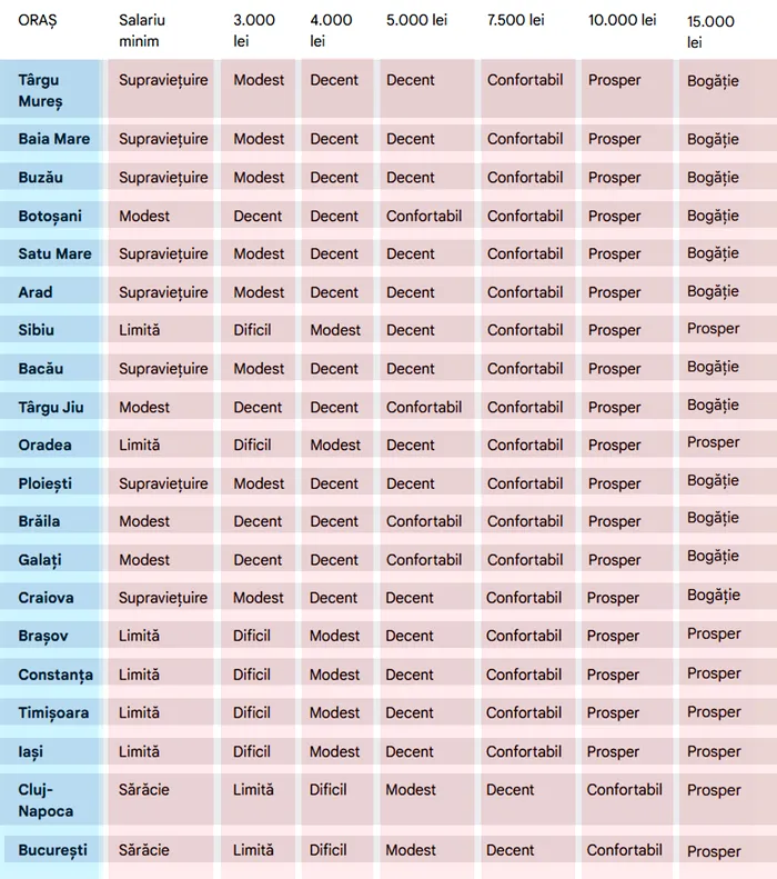 Supraviețuire, modestie sau bogăție? Gândul.ro aduce în atenție un tabel (vezi mai jos) în care îți arată ce fel de trai duci în 2026, în funcție de salariul actual și de orașul în care locuiești. Au fost alese 20 cele mai mari orașe din România, precum și 7 scenarii salariale nete.