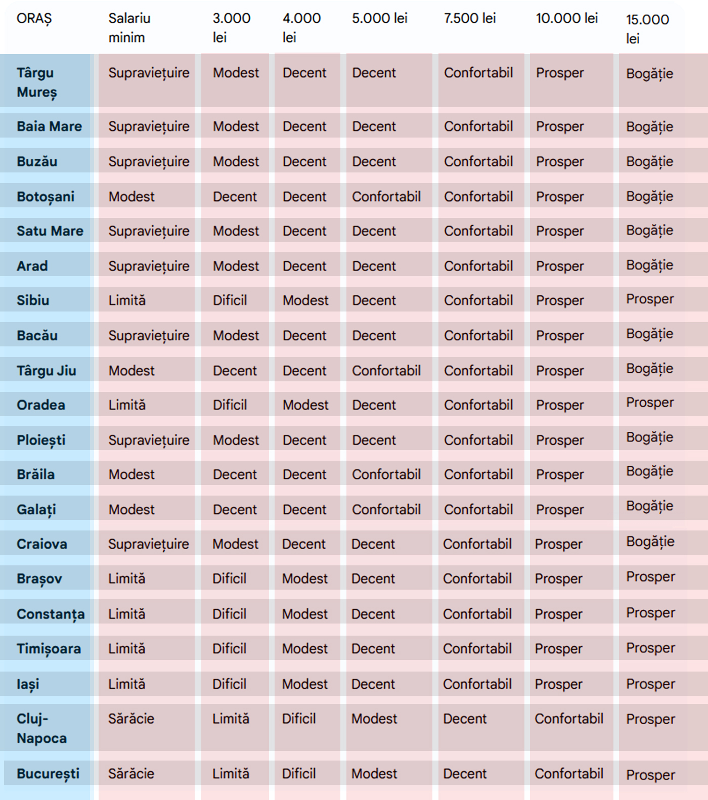 - Târgu Mureș – un trai decent ar fi cu un salariu de 4.000-5.000 de lei;