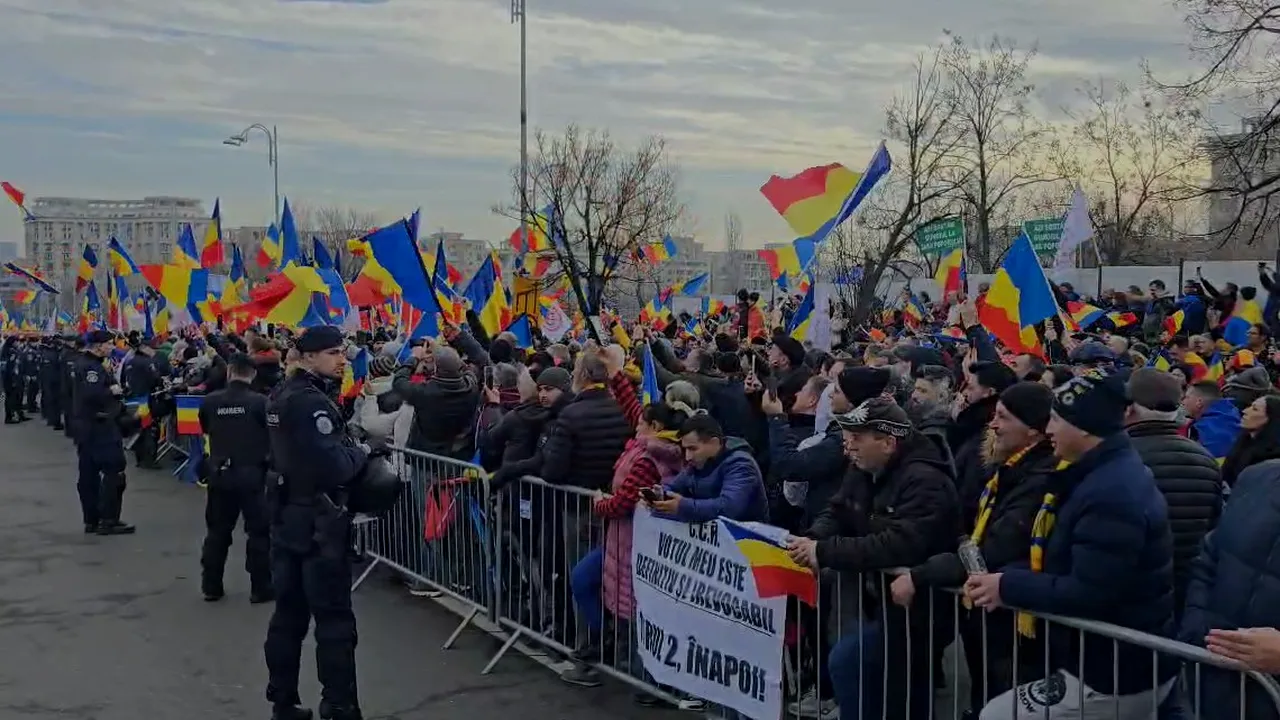 La această oră, câteva mii de susținători ai lui Călin Goergescu s-au prezentat la protest, purtând pancarte pe care scrie „Turul 2 înapoi”, „Dumnezeu este cu noi, fiți și voi cu noi”, „Demisia Curtea Constituțională”, „CCR-ul suntem noi”, „Jos dictatura” sau „Călin Georgescu, omul lui Dumnezeu”.