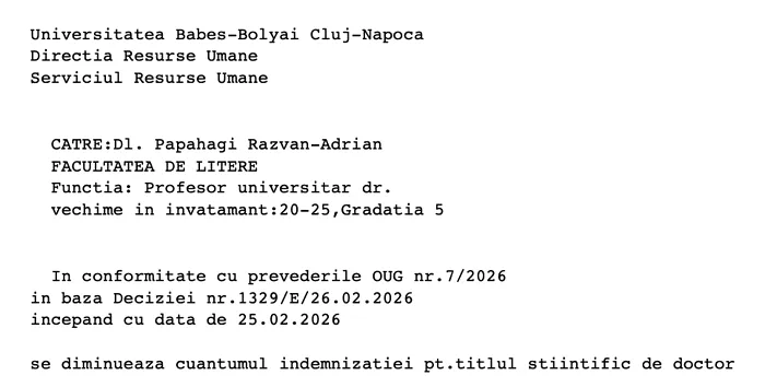 „Tocmai am fost anunțat oficial că mi s-a redus sporul de doctorat de la 950 la 500 brut. E o tăiere mascată de salarii, întrucât nu poți fi profesor universitar fără doctorat.