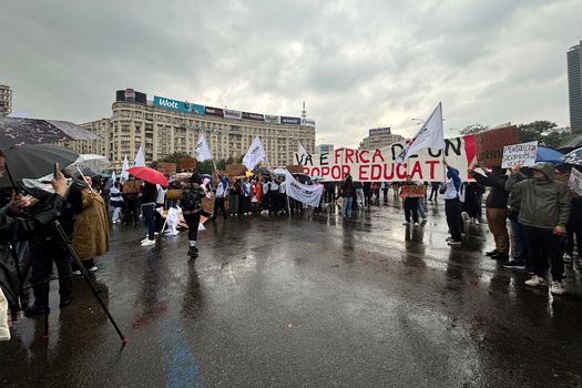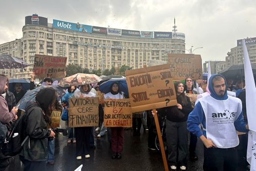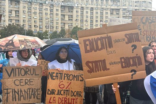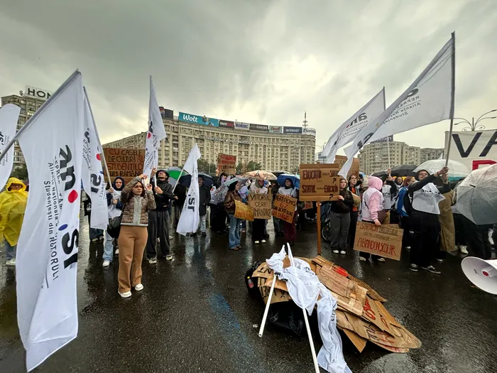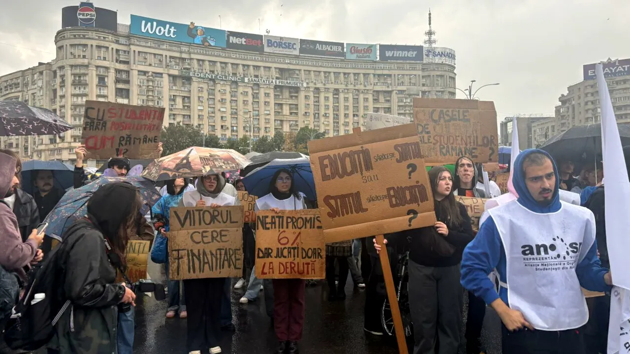 Prima pagină » Actualitate » Sute de studenți protestează în ploaie, în Piața Victoriei, față de măsurile Guvernului Bolojan