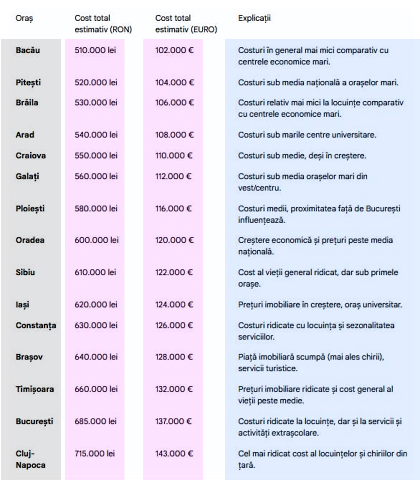 • București: cost total estimativ la 685.000 de lei (137.000 de euro). Sunt costuri ridicate la locuințe, dar și la servicii și activități extrașcolare.