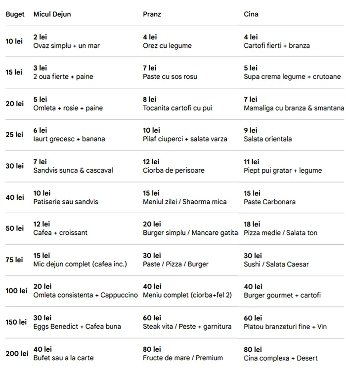 Prima pagină » Actualitate » TABEL | Ce se mănânci la micul dejun, prânz și cină, în funcție de bugetul zilnic: de la 10 lei la 200 lei de persoană