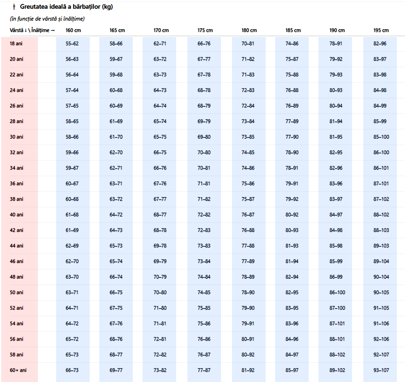 Gândul a întocmit un tabel exclusiv pentru persoanele de sex masculin în care arată greutatea ideală în funcție de vârstă. Valorile prezente mai jos sunt calculate pentru un IMC (indice de masă corporală) între 21 și 25, valori care sunt considerate „sănătoase”. De menționat faptul că odată cu vârsta, greutatea ideală poate crește ușor (1–2 kg per deceniu), deoarece metabolismul încetinește și densitatea musculară scade.