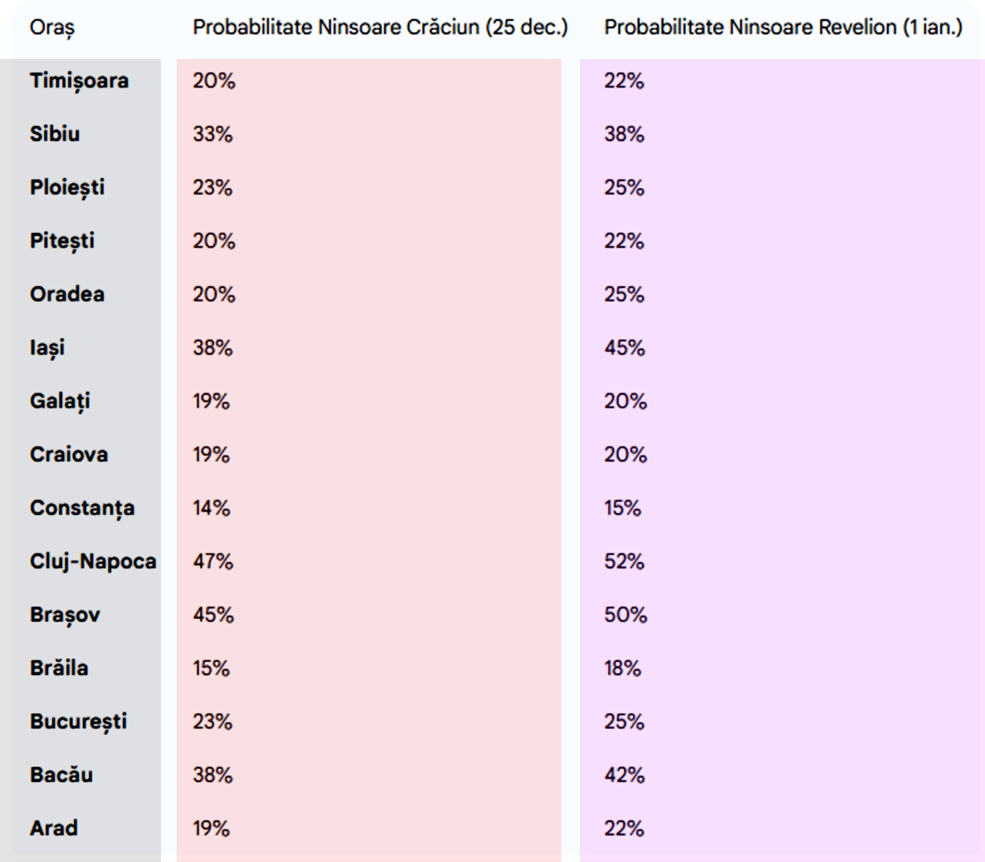 În prima zi a Noului An, pe 1 ianuarie 2026, cea mai mare probabilitate să ningă este în Cluj-Napoca (52%), precum și în Brașov (50%). Clasamentul este urmat de Iași, cu o probabilitate de 45%. La polul opus se află Constanța, cu o probabilitate de 15 procente.