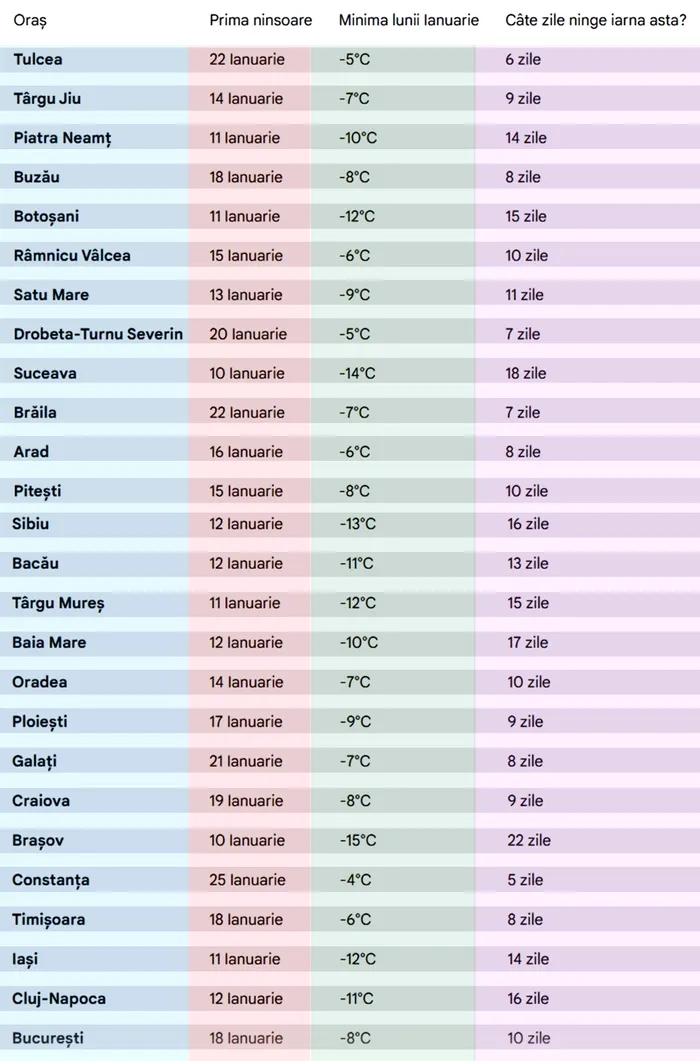 Prima pagină » Actualitate » Tabel ninsori | Pe ce dată vin ninsorile în orașul tău, câte zile ninge și care va fi temperatura minimă în ianuarie, potrivit meteorologilor