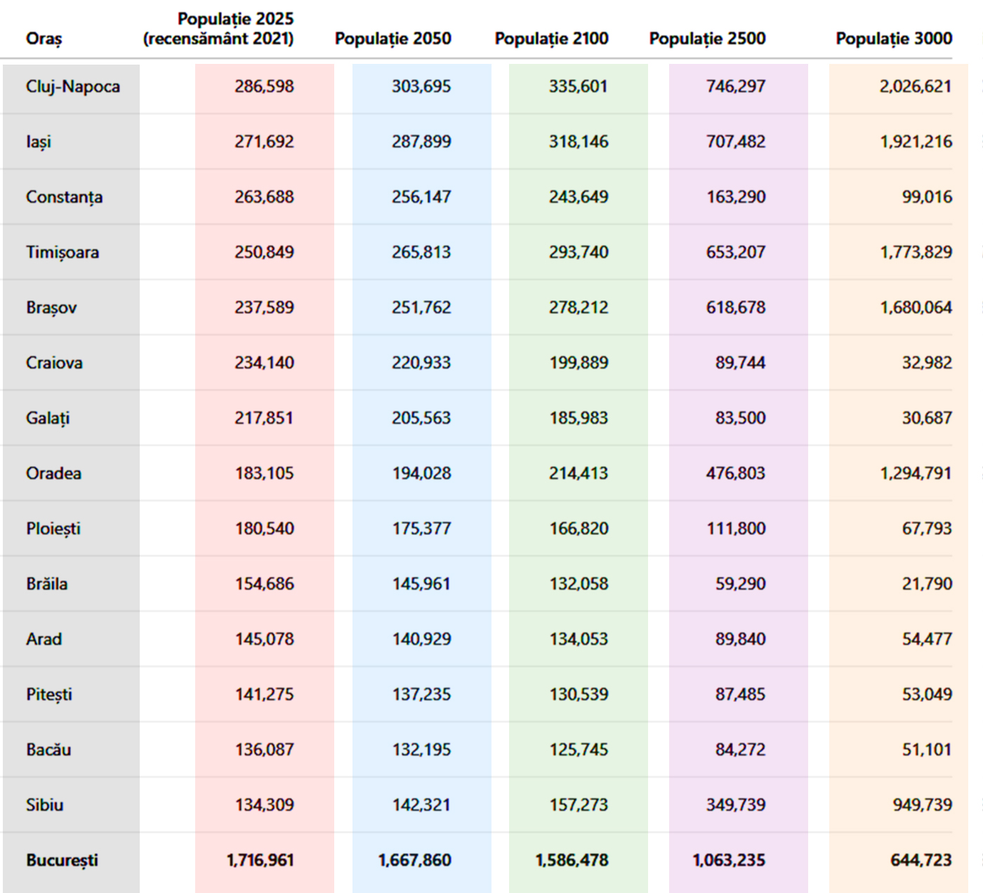 Câți locuitori vor avea marile orașe din România în anul 2050, 2100, 2500 și în 3000