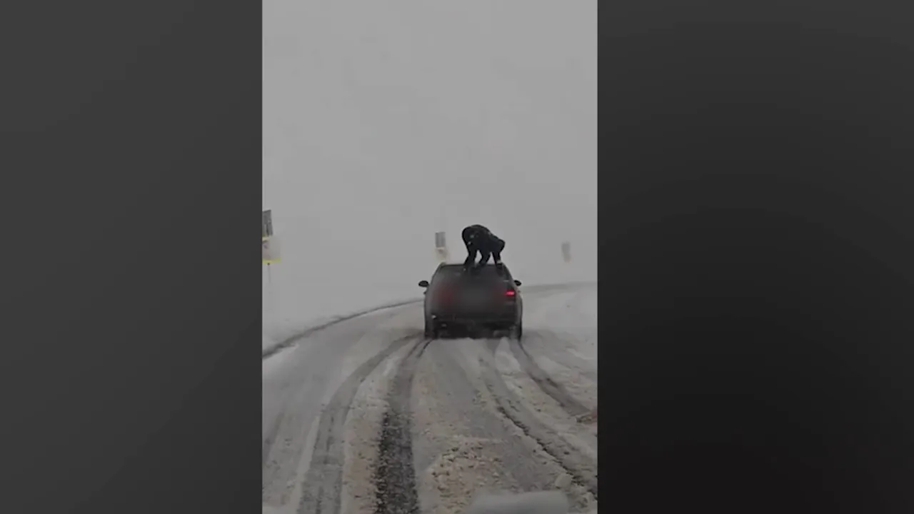 Un tânăr a fost filmat în timp ce sare pe portbagajul unei mașini aflate în mers, în județul Vaslui. Culmea este că șoferul merge în zigzag, iar pe carosabil este zăpadă.