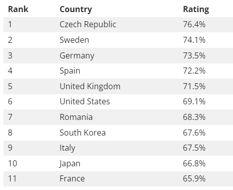 Cehia se află în fruntea clasamentului, datorită mașinilor Skoda (care este, de fapt, singura companie de automobile care mai există în această țară). Jurnaliştii din zona auto apreciază de multă vreme de calitatea maşinilor pe care le produce Skoda, mai ales că acestea costă de obicei mai puţin decât modelele similare de la compania-mamă a Skoda, Volkswagen.