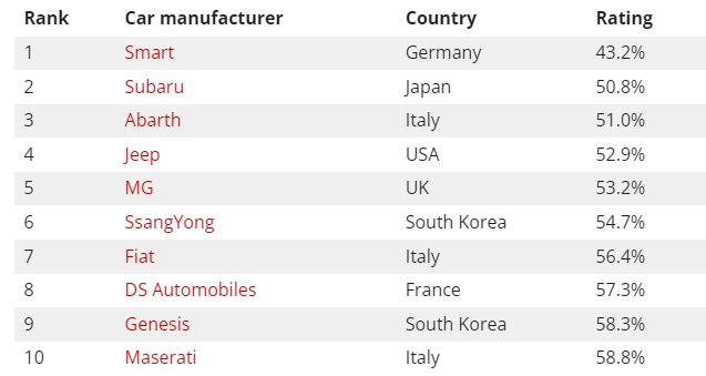 În partea de jos a topurilor mărcilor, mașina Smart, deținută de Mercedes-Benz și producător de mașini de oraș electrice mici, este marca cu cel mai mic rating scoasă la vânzare în 2022.