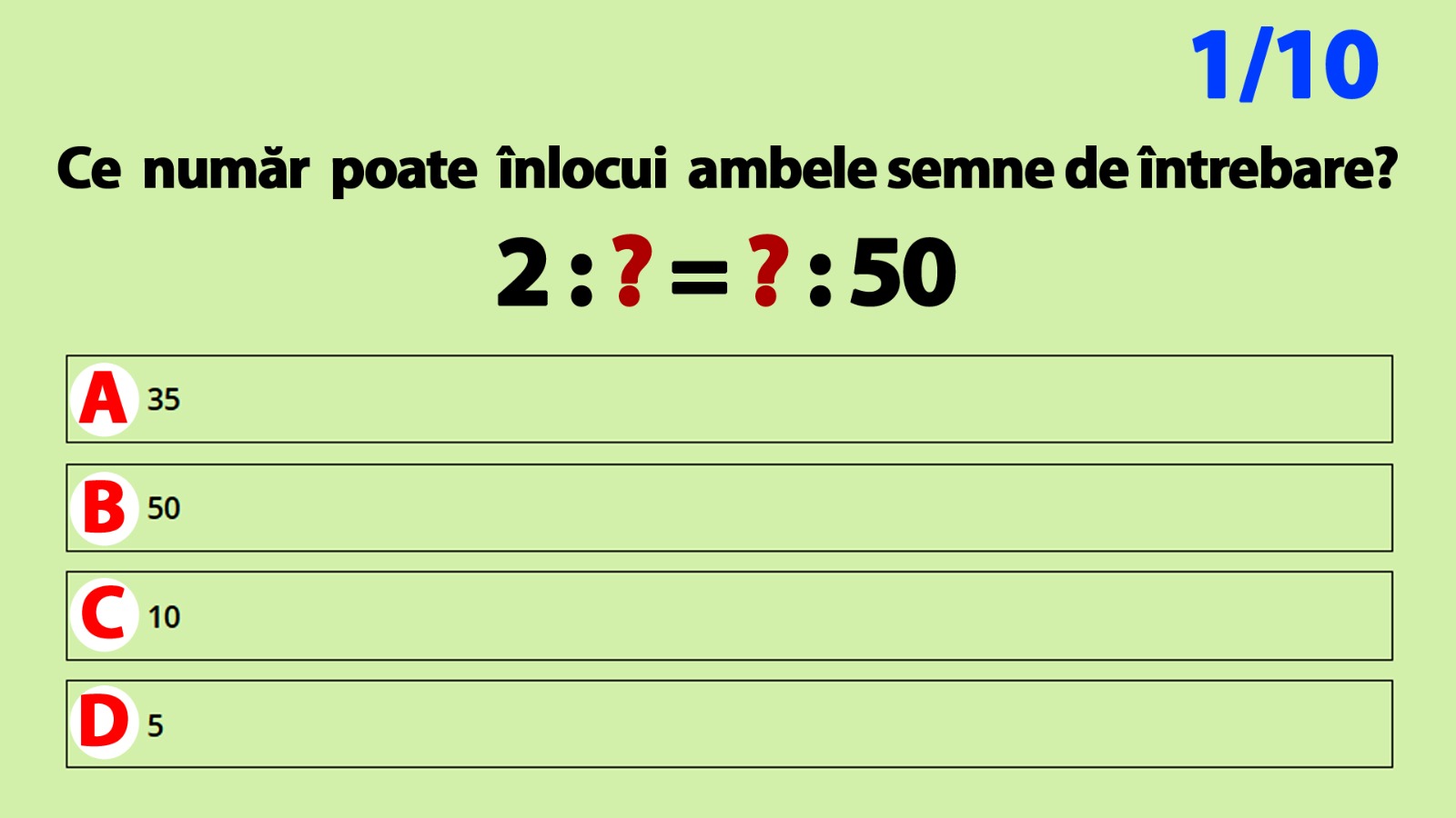 Test calculare IQ România | Ce număr poate înlocui ambele semne de întrebare: 2:? = ?:50