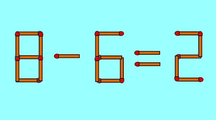 După cum vedeți în imaginea de mai jos, dacă mutați bățul de chibrit de la cifra 8 și îl adăugați la cifra 6, ecuația devine: 8 – 6 = 2.