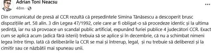 ”Din comunicatul de presă al CCR rezultă că președintele Simina Tănăsescu a descoperit brusc dispozițiile art. 58 alin. 3 din Legea 47/1992, cele care ar fi obligat-o să procedeze identic și la ultima ședință, iar nu să provoace un scandal public artificial, expunând furiei publice 4 judecători CCR. Exact cum se aplică acum (adică fără isterii) trebuia să se aplice și în decembrie, că nu a schimbat nimeni legea între timp. Iată că deliberările la CCR se mai și întrerup, legal, și nu trebuie să deliberezi și la cimitir sau ce năzbâtii mai spuneau unii”, scrie avocatul.