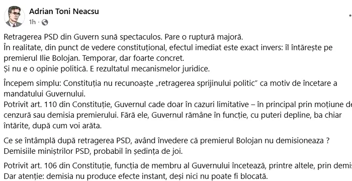 Retragerea sprijinului politic al premierului Bolojan de către PSD s-ar putea să fie doar un joc strategic iluzoriu. Avocatul Adrian Toni Neacșu a explicat, într-un amplu comentariu pe contul său de socializare, de ce retragerea PSD din coaliția de guvernare nu va avea ca efect slăbirea Guvernului. Singura soluție viabilă ar fi inițierea unei moțiuni de cenzură.