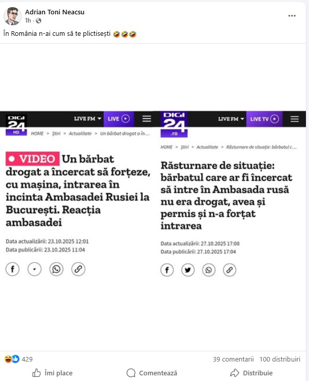 Prima pagină » Actualitate » Toni Neacșu ironizează Digi24 în cazul șoferului „drogat” care ar fi încercat să intre în Ambasada Rusiei: „În România n-ai cum să te plictisești”