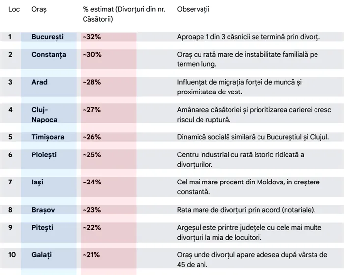 Pe primul loc în acest top se află Bucureștiul, cu o rată estimată de aproximativ 32%. Cu alte cuvinte, aproape una din trei căsnicii din Capitală se încheie prin divorț. Acest procent ridicat ar putea fi pus pe seama ritmului de viață accelerat, a presiunii profesionale, dar și a independenței financiare mai mari.