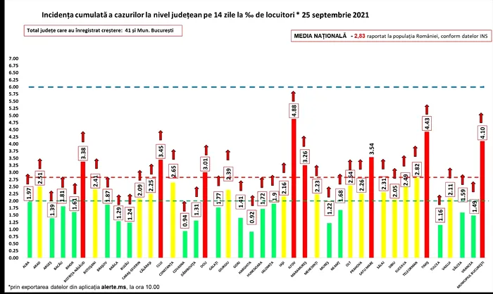 Coeficientul infectărilor cumulate la 14 zile, raportate la 1.000 de locuitori este calculat de către Direcțiile de Sănătate Publică, la nivelul Municipiului București și al județelor.