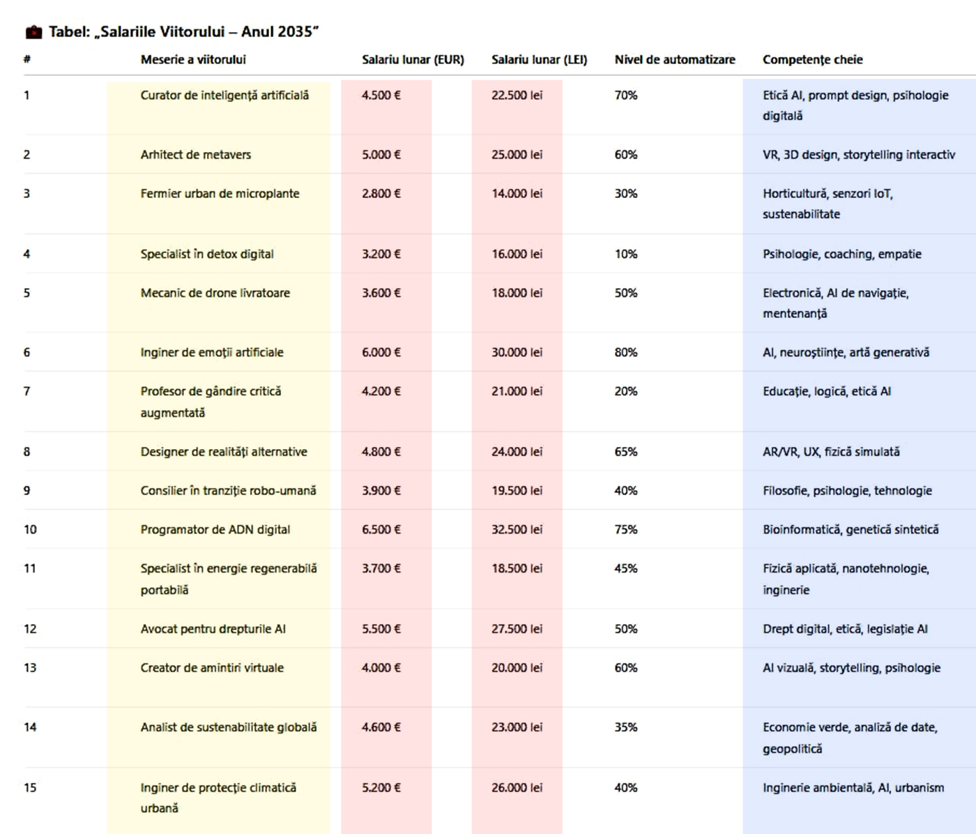 Un inginer de emoții artificiale ar putea câștiga 6.000 de euro (30.000 de lei), iar nivelul de automatizare s-ar situa la 80%. Competențe cheie: AI, neuroștiințe, artă generativă.