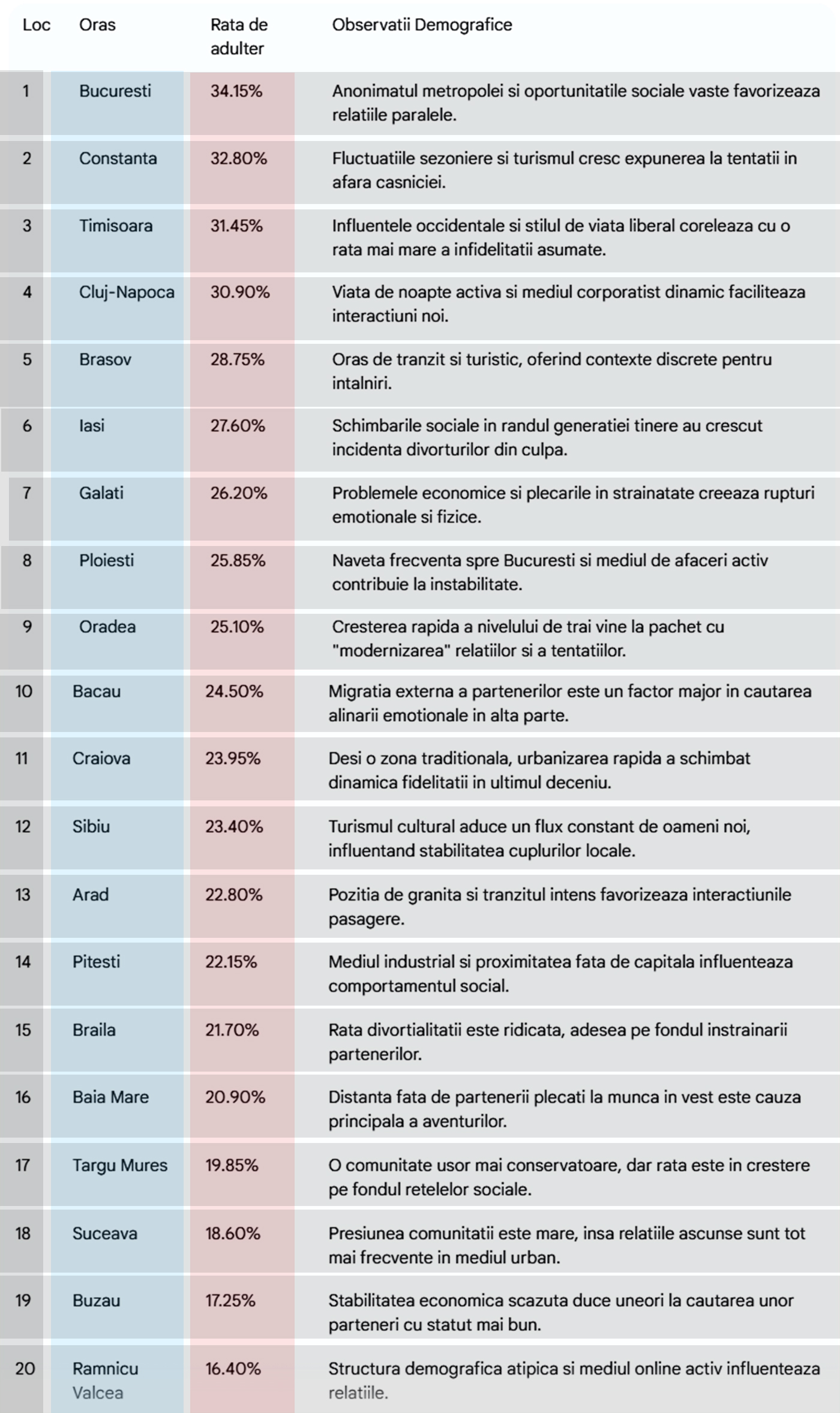 V-ați gândit vreodată în care dintre orașele din România soții ajung cel mai des să fie înșelați de către neveste? Gândul.ro a întocmit un top în acest sens în care se găsesc 20 de orașe. Iată tabelul mai jos în care este estimată o „rată de adulter”, precum și o serie de observații demografice.