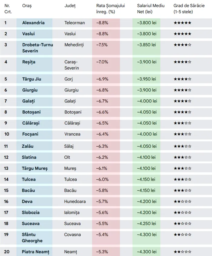 În acest nou tabel, Gândul a pregătit un top al celor celor mai sărace orașe din țară, acum, pe final de an. În acest top, se poate vedea că județele Vaslui și Teleorman au avut în mod istoric cele mai mari rate de șomaj din țară (datele citate indică rate de până la 8.8% la nivel de județ), la un salariu mediu net de 3.800 de lei. „Gradul de sărăcie” al acestor două orașe din județe diferite este de 5 stele din 5, adică cel mai ridicat dintre toate orașele analizate. Iată, în continuare, topul.