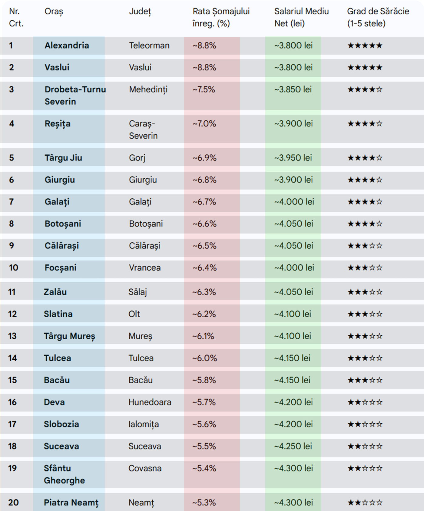Top 20 cele mai sărace orașe din România, la final de 2025. Tabelul complet, în funcțide de rata de șomaj și de salarii.