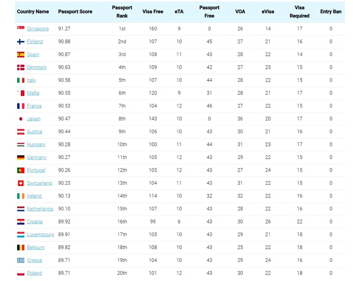 A fost întocmit un clasament de către VisaGuide.World cu cele mai puternice pașapoarte din lume. Primul loc este ocupat, în continuare, de Singapore. Potrivit datelor, se precizează că acel clasament ar fi considerat unul dintre cele mai fiabile din cadrul industriei de turism. În acest sens, se evaluează 199 de țări și de teritorii la nivel global pentru efectuarea acestui clasament.