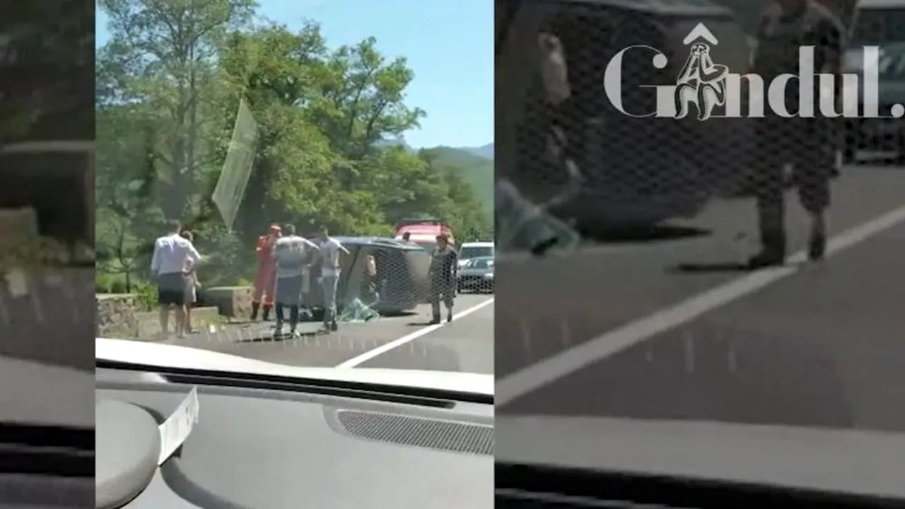 În imaginile exclusive primite de Gândul.ro se vede cum o mașină de teren, cu număr de înmatriculare de Cluj, este răsturnată pe o parte și blochează o bandă de circulație pe Valea Oltului.