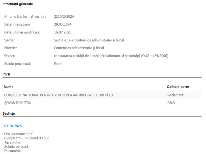 Fostul ofiter de securitate Dumitru Șovar este acuzat de Consiliul Național pentru Studierea Arhivelor Securității (CNSAS) că a făcut politie politică, iar magistrații de la Curtea de Apel București vor da verdictul, în acest dosar, în data de 3 octombrie 2025, după două amânări.