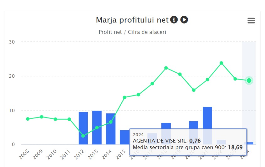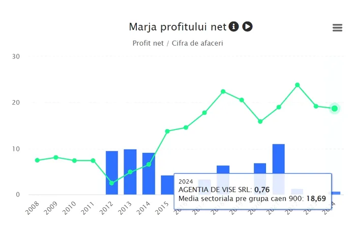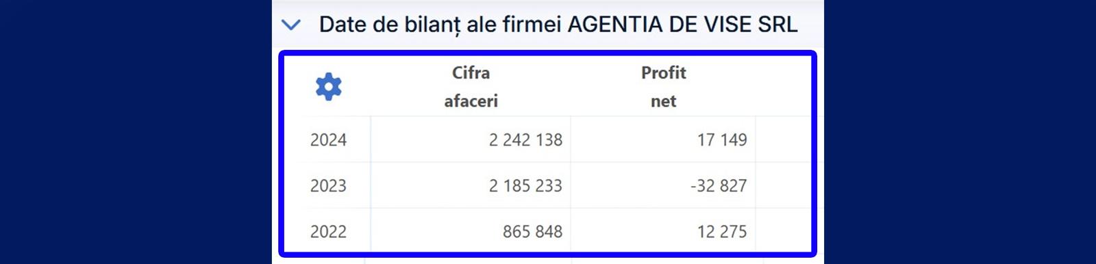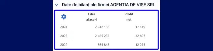 Încasările firmei Agenția de Vise pe anul 2024, ultimul an pentru care există raportări, sunt de 2,2 milioane de lei, conform datelor de la Ministerul de Finanțe, adică circa 450.000 de euro pe an. Rezultă, deci, 37.500 de euro pe lună în buzunarele firmei.