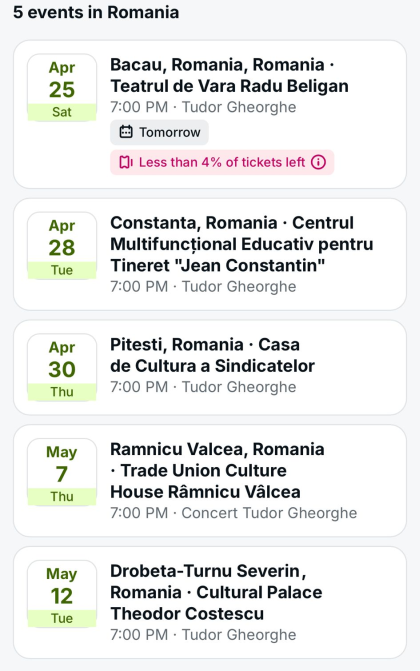 Trubadurul anotimpurilor va susține încă 5 concerte în perioada următoare. Astfel, maestrul Tudor Gheorghe va putea fi ascultat în Bacău pe 25 aprilie, Constanța pe 28 aprilie, Pitești pe 30 aprilie, Râmnicu Vâlcea pe 7 mai și Drobeta Turnu Severin pe 12 mai.