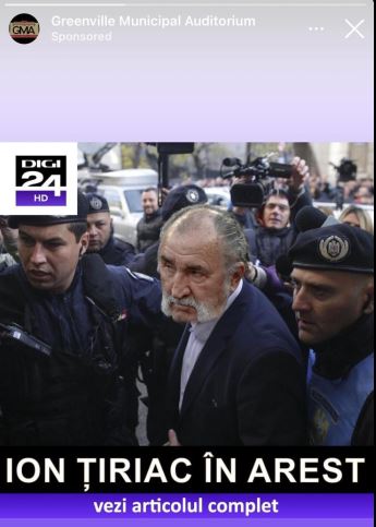 O astfel de postare apare ca fiind făcută publică de Greenville Municipal Auditorium, un link ducând către site-ul unde s-ar afla știrea de ultimă oră care îl vizează pe omul de afaceri Ion Țiriac.
