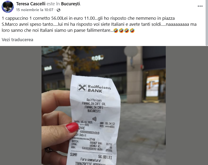 „1 cappuccino, 1 croissant, 56,00 lei în euro, 11,00… I-am răspuns că nici măcar în Piața San Marco nu aș cheltui atât… El mi-a răspuns: „Ești italiancă și ai mulți bani…” Nu, dar ei știu că noi, italienii, suntem o țară falită…”, a scris aceasta pe Facebook.