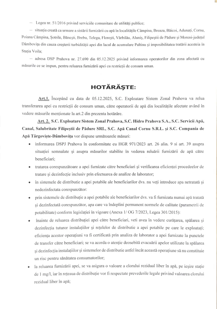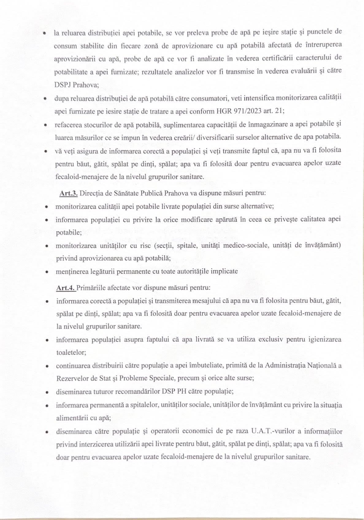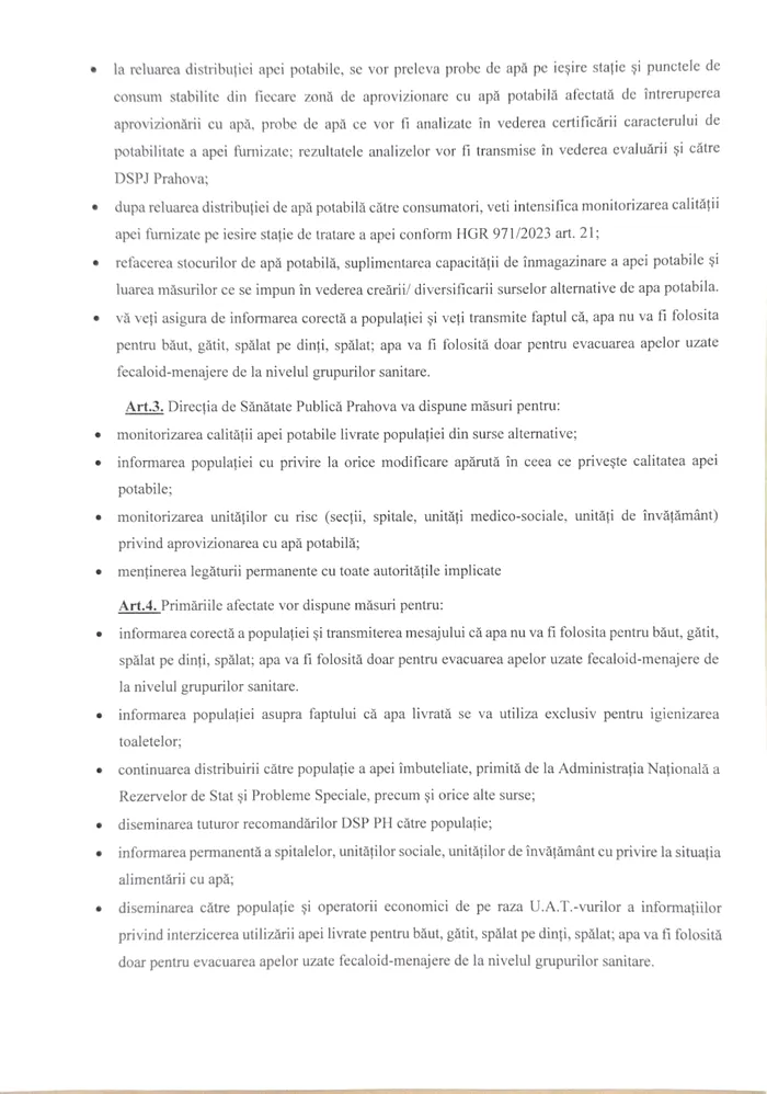 De asemenea, hotărârea cuprinde o serie de măsuri ce vor fi implementate la nivelul operatorilor de apă, DSP Prahova, ISU Prahova și primăriilor afectate.
