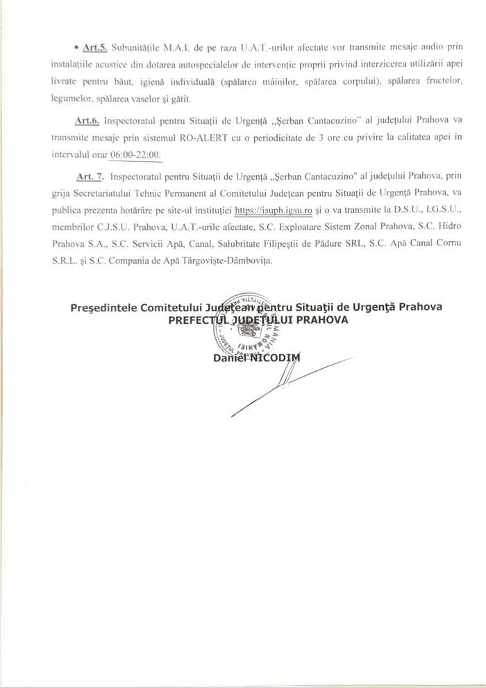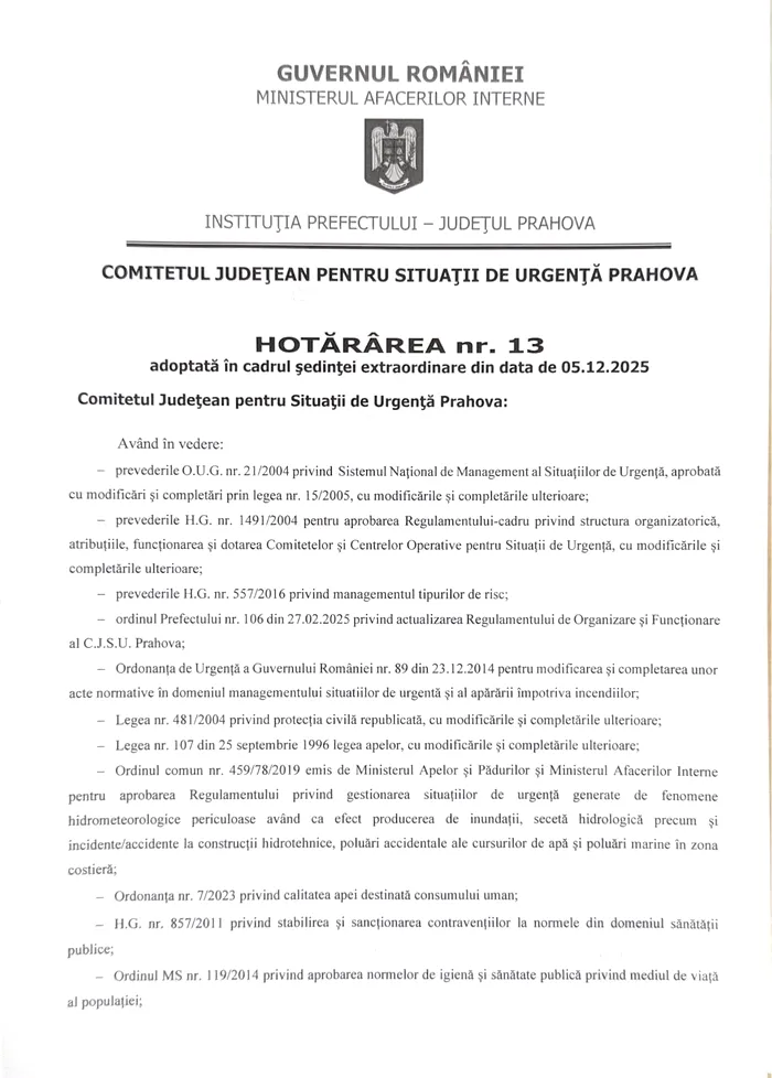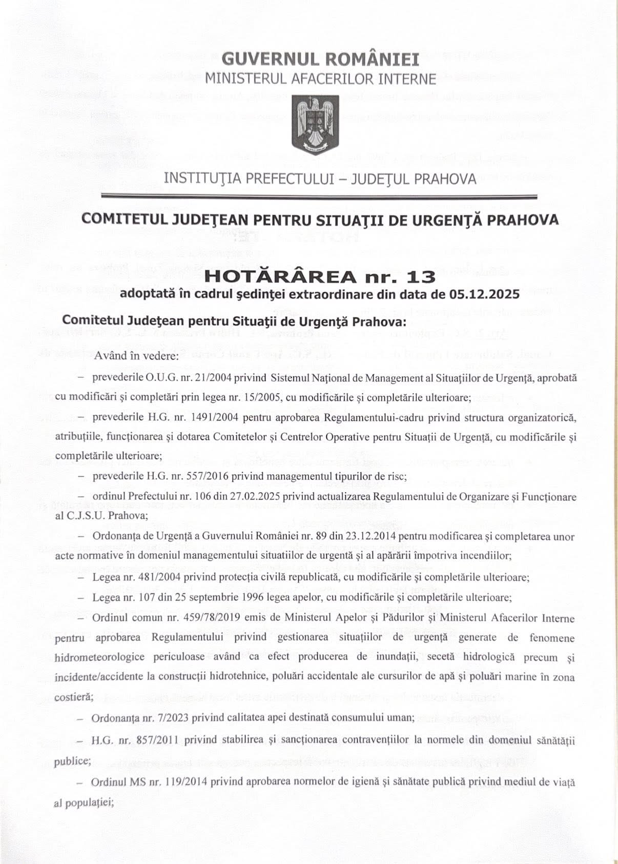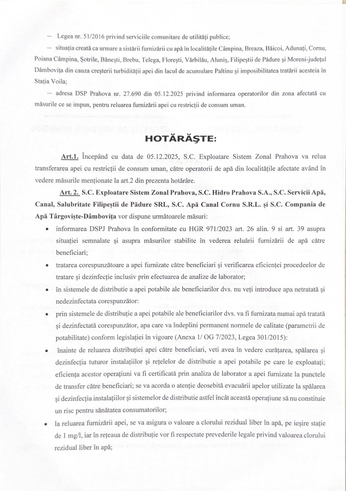 De asemenea, hotărârea cuprinde o serie de măsuri ce vor fi implementate la nivelul operatorilor de apă, DSP Prahova, ISU Prahova și primăriilor afectate.