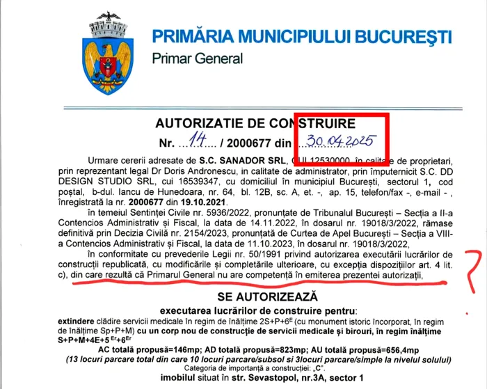 În cuprinsul autorizației de construire, chiar sub semnatura Primarului mun. București, apare mențiunea că acest act este nelegal, fiind emis de primărie cu încălcarea competenței ( art. 4 lit c din Legea 50/1991). Chiar emitentul autorizației, Primarul Nicușor Dan, executând în bătaie de joc o hotărâre judecătorească, lăsa loc pentru orice doritor să ceară și sa obțină în justiție anularea acesteia autorizații, de vreme ce este emisă de un organ administrativ necompetent.