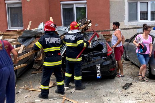 Acoperișul unui bloc a căzut pe multe autoturisme, din cauza vântului puternic, în Uioara de Sus, o localitate componentă a orașului Ocna Mureș din județul Alba.