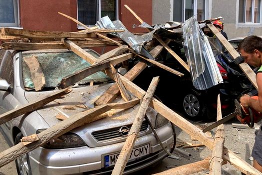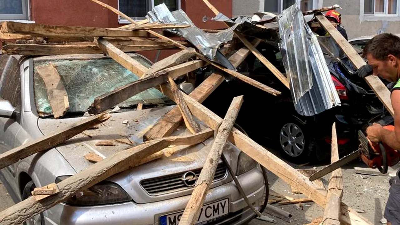 Prima pagină » Actualitate » FOTO-VIDEO | Un acoperiș smuls de vânt a căzut peste mai multe mașini, într-o localitate din Alba. Județul se află sub cod portocaliu de instabilitate atmosferică