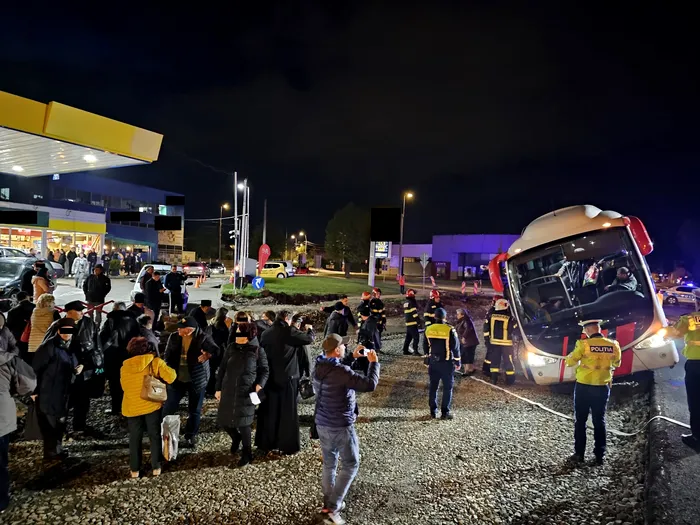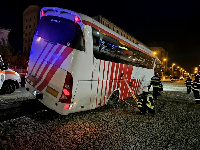 Autocarul a fost stabilizat și pompierii au evacuat persoanele din interiorul autovehiculului.