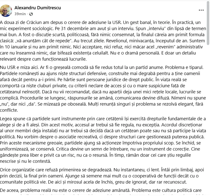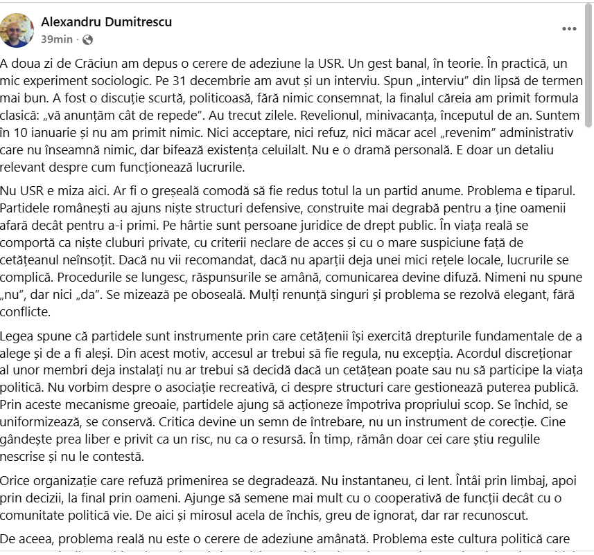 În urmă cu puțin timp, el a revenit asupra faptelor și a povestit ce s-a mai întâmplat, pe parcurs. Acesta a notat pe Facebook că în a doua zi de Crăciun a depus cerere de adeziune la USR, un gest banal, în teorie. În practică, un mic experiment sociologic. Pe 31 decembrie am avut și un interviu. Spun interviu” din lipsă de termen mai bun. A fost o discuție scurtă, politicoasă, fără nimic consemnat, la finalul căreia am primit formula clasică: vă anunțăm cât de repede”. Au trecut zilele. Revelionul, minivacanța, începutul de an. Suntem în 10 ianuarie și nu am primit nimic. Nici acceptare, nici refuz, nici măcar acel revenimadministrativ care nu înseamnă nimic, dar bifează existența celuilalt. Nu e o dramă personală. E doar un detaliu relevant despre cum funcționează lucrurile”, spune acesta.